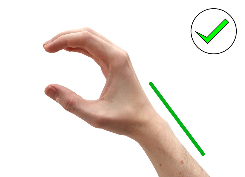 For my own hands, keeping my wrists straight entails having my fingertips directly above my thumb, evident from the pictures. But as everyone's hands are different, this may or may not work for you.