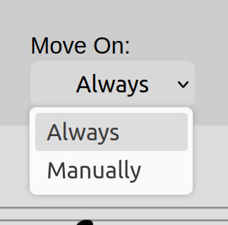 The 'move on' option in the top bar controls when the tool moves from one phrase to the next.