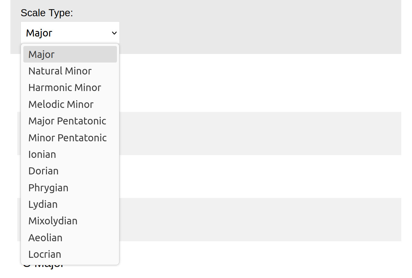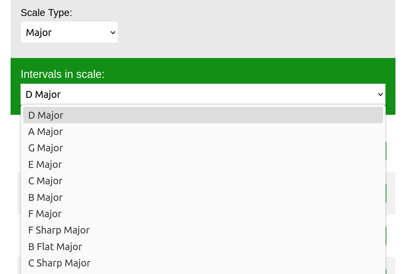 The tool allows you to select the type of scale (Major, minor etc), and the root note for that scale like C, D, and so on. It then generates exercises moving through that scale in different steps (thirds, fourths and so on).