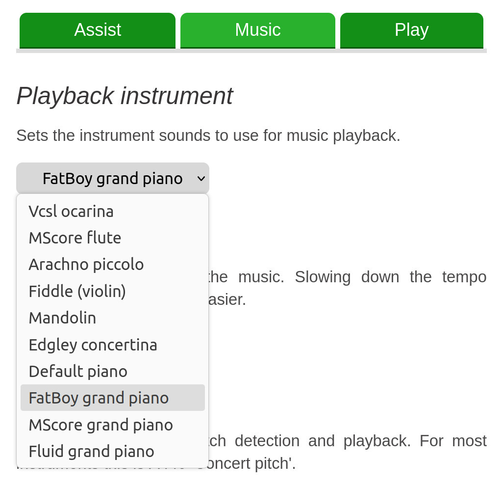If you open the settings menu, there is an option 'playback instrument' under the 'music' tab. This changes the instrument sound you hear. It is also possible to change the pitch standard if you are playing an instrument not tuned to A440.